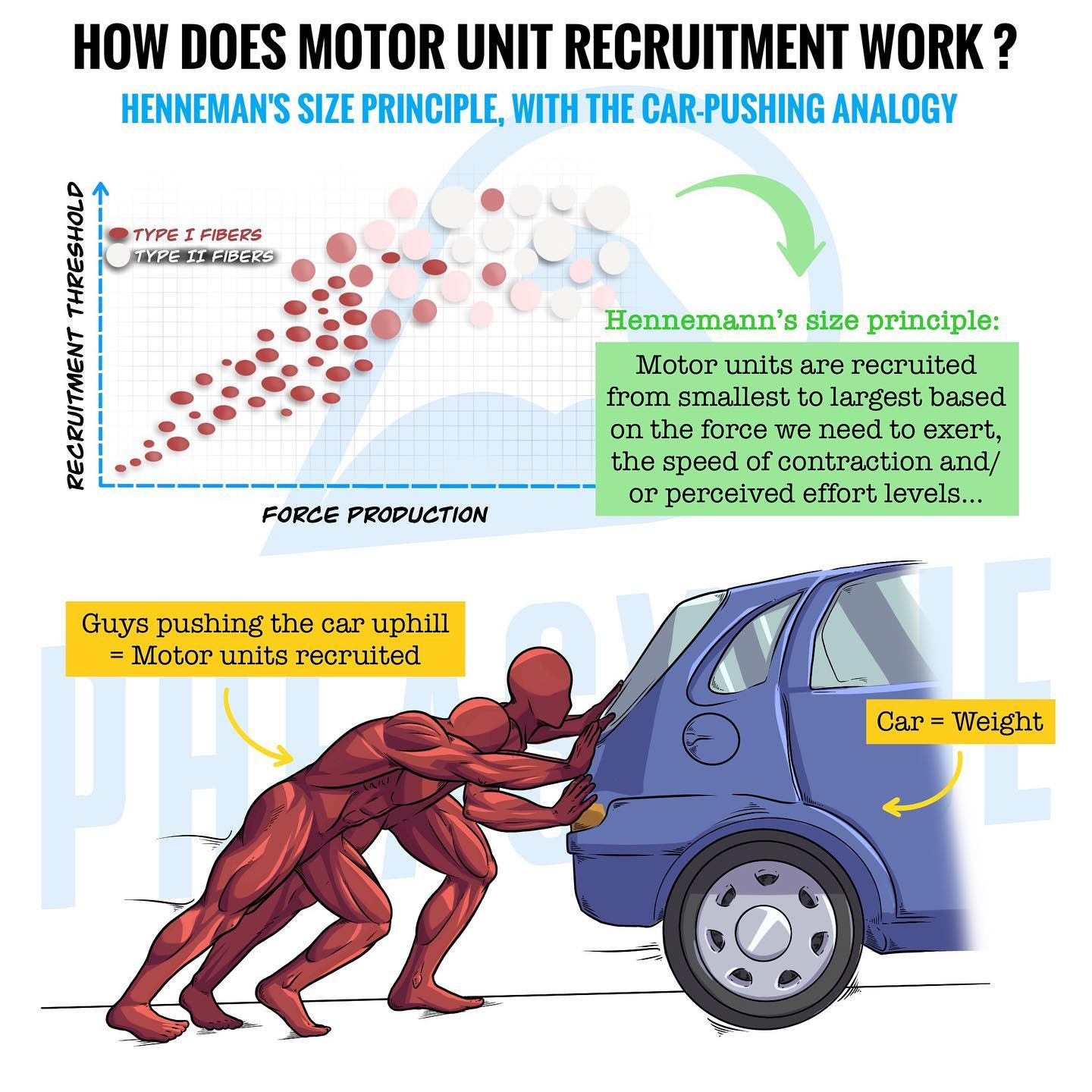 When you consistently undergo resistance training, your body actually improves at the recruitment step of the process. You are able to recruit more more muscle fibers and contract them more efficiently, thus becoming “stronger” despite not adding any additional muscle mass. This is why you can lift more weight on a near weekly basis for the first three months or so of consistent training; your body approaches capturing 100% of its total available strength instead of the perhaps 30-50% before you started training. You can’t, and don’t need to, increase your overall muscle mass at this stage. Rather, you need to better capture and leverage what you already have. Eventually, your body will grow muscles (a process known as hypertrophy) in response to resistances consistently greater than the current muscle fibers and motor units can handle.